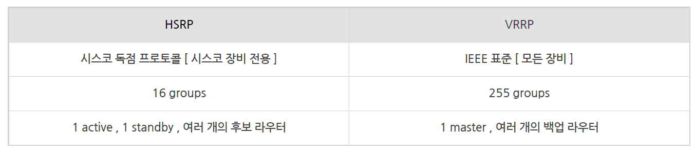 FHRP 에는 HSRP, VRRP, GLBP 등이 있으며, Cisco 표준 이중화 프로토콜인 HSRP와 VRRP는 비슷하다.