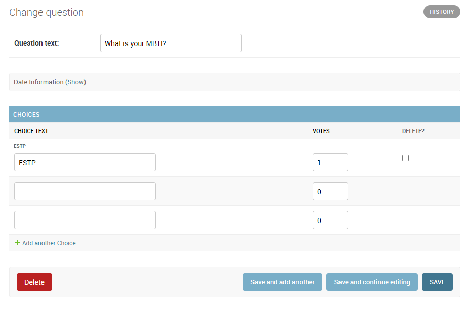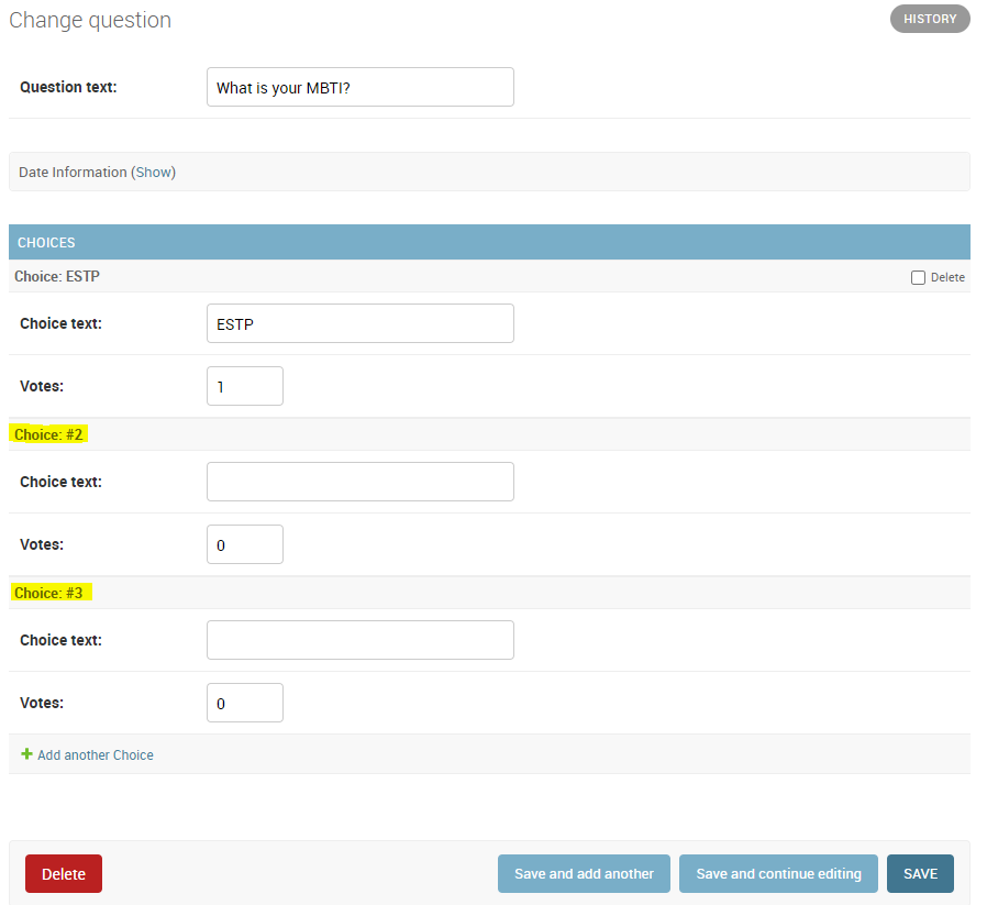 # Admin 사이트를 설명하면서 4.1.6 절에서 입력한 Choice 레코드가 보입니다.
