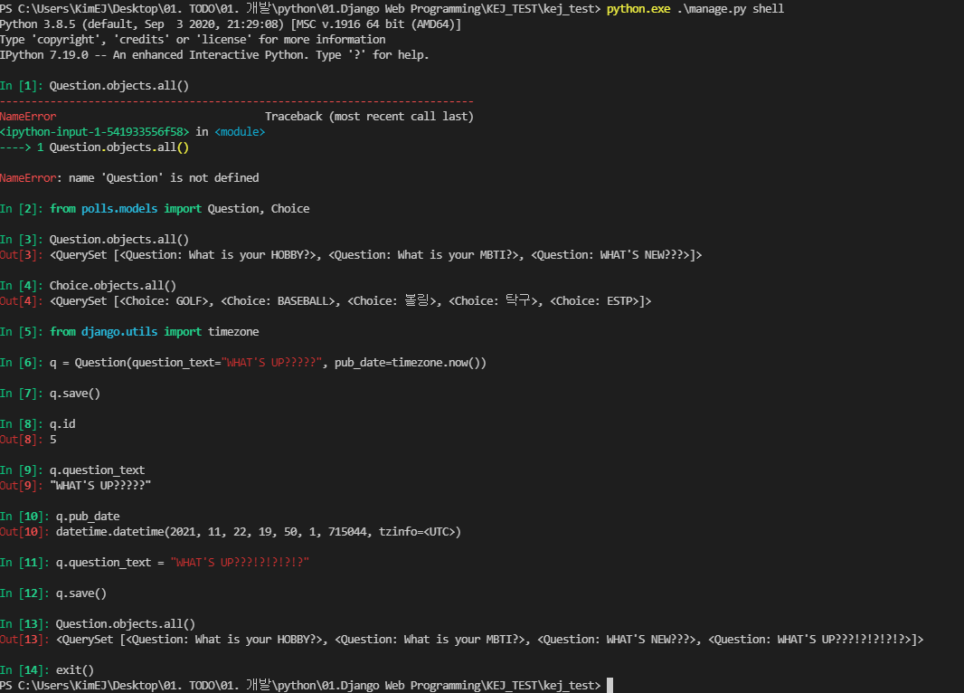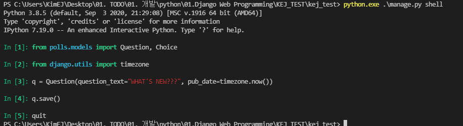 아래 shell로 polls 애플리케이션의 데이터를 생성 및 변경해보는 실습을 해봅니다.